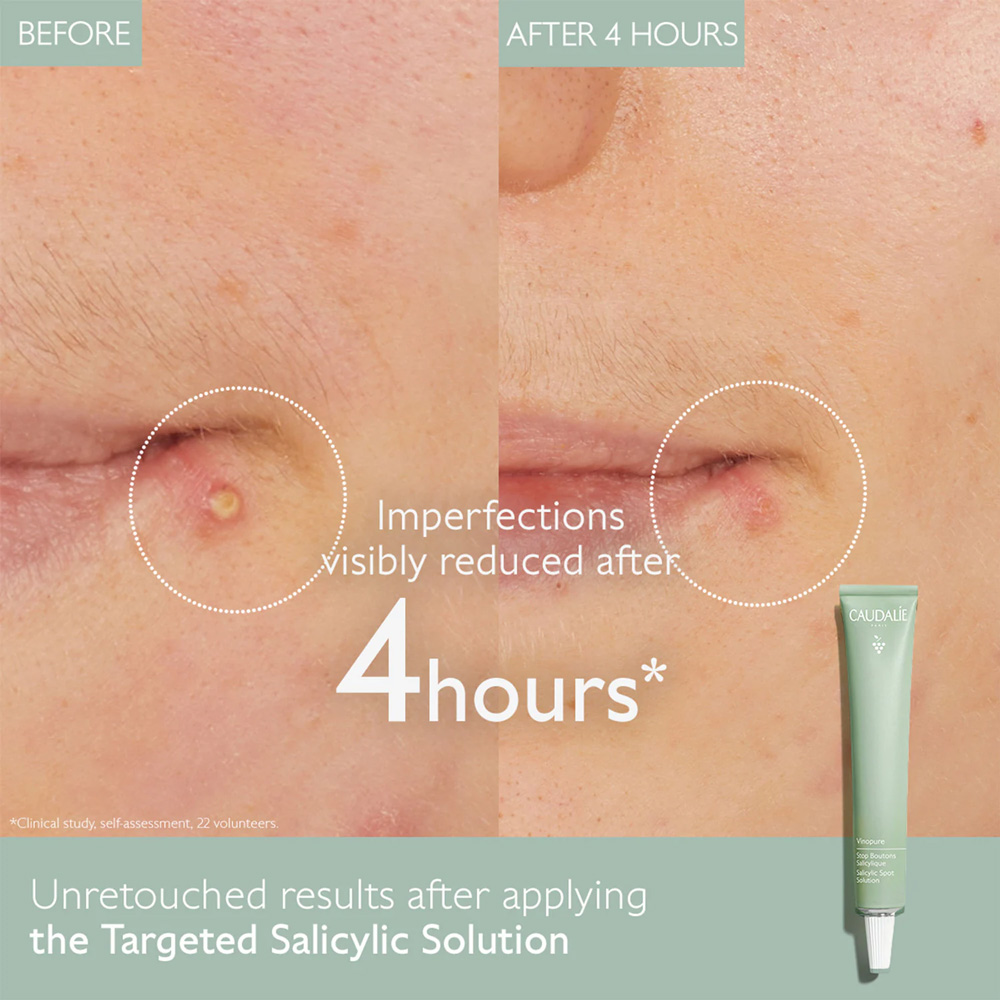 Caudalie vinopure salicylic spot është një solucion i krijuar për veprim lokal, për lëkurë të prirur ndaj akneve. Me përbërës me origjinë natyrale, ky produkt synon reduktimin e akneve në 1 orë. Solucioni ka një formulë vegane që e lejon atë të pastrojë, thajë dhe pakësojë skuqjen. Veçanërisht i përshtatshëm për lëkurën e prirur ndaj akneve, ky produkt është ideal për reduktimin e dukshëm të akneve të lokalizuara. Mund të përdoret edhe në lëkurë të thatë dhe të ndjeshme.