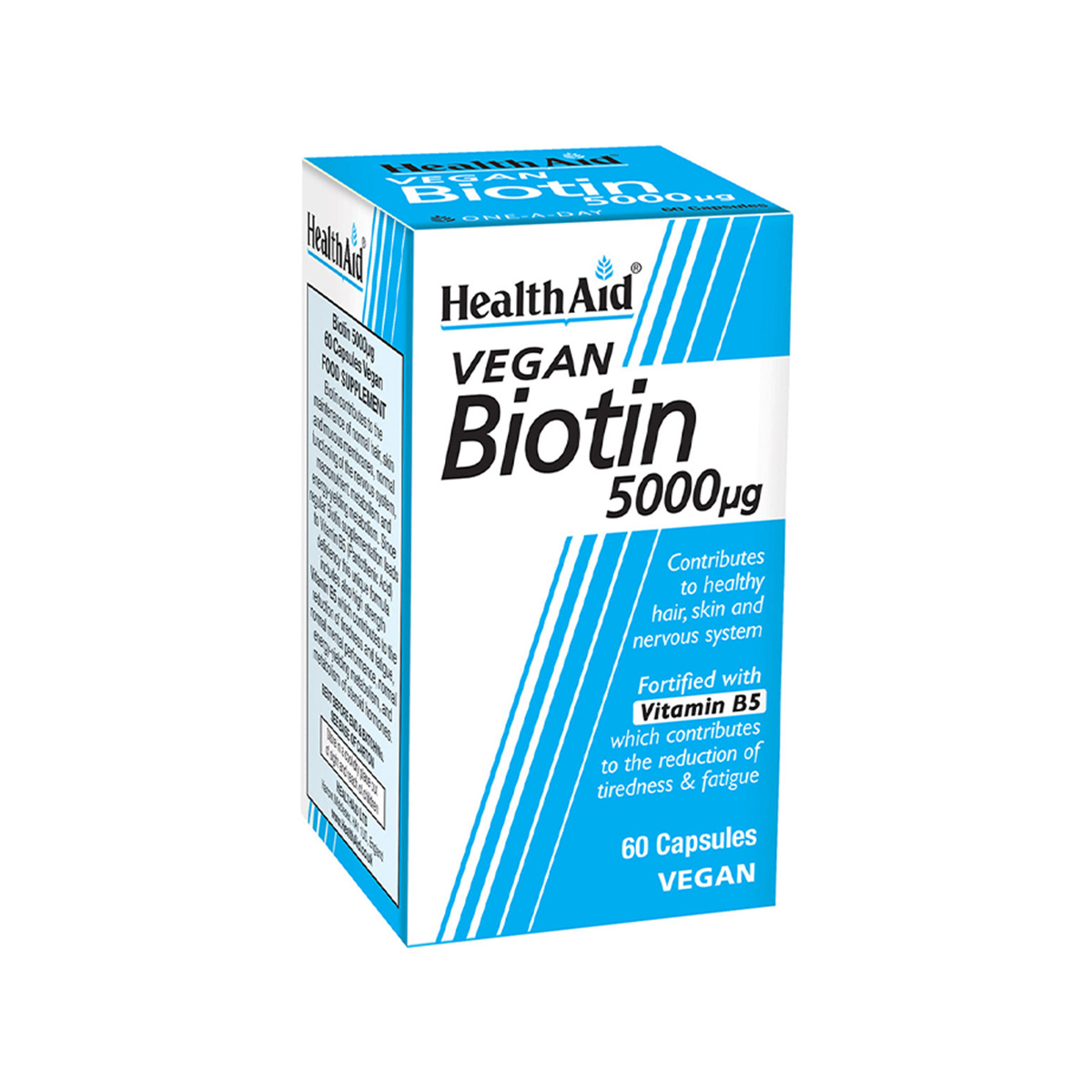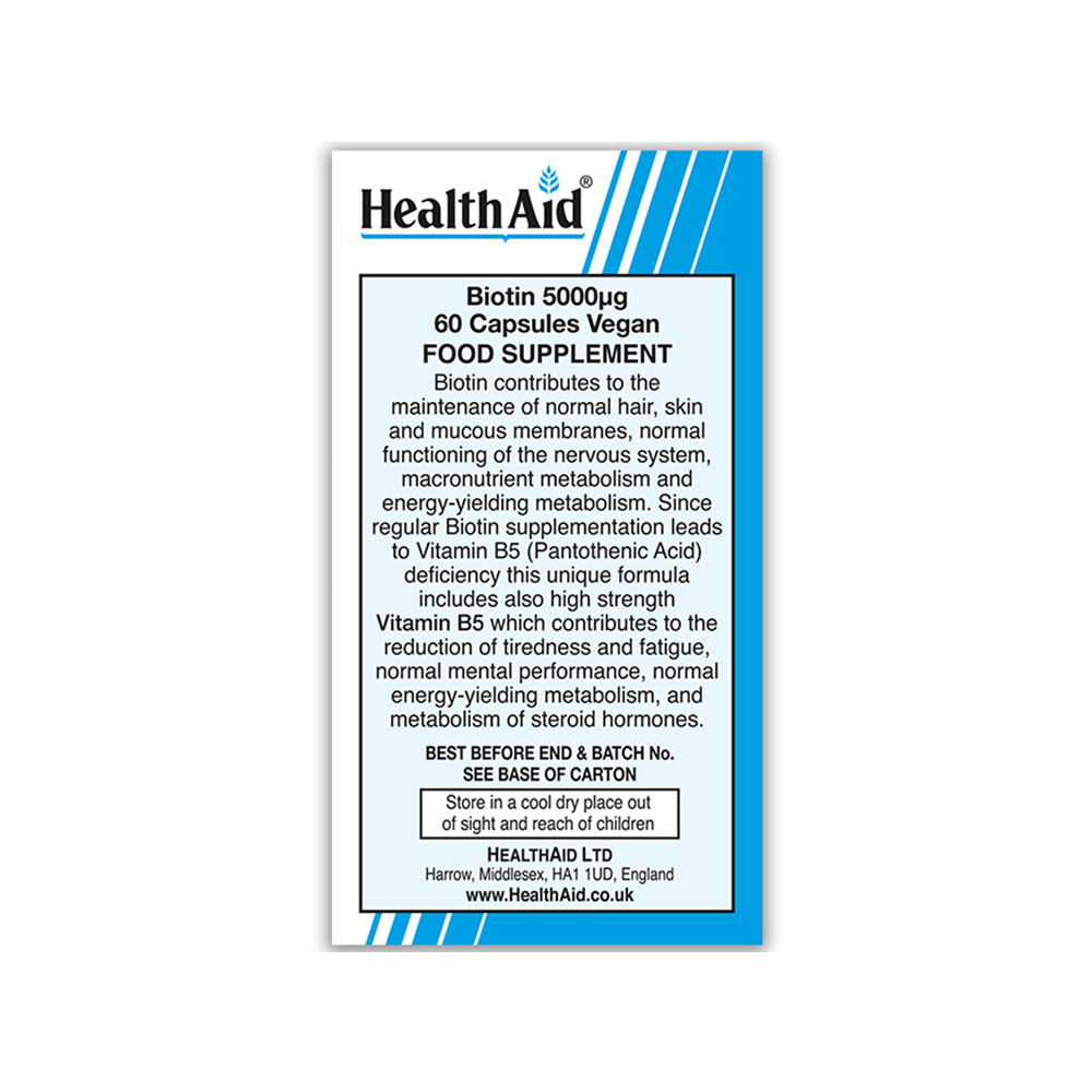 Kapsulat HealthAid Biotin 5000mcg janë të pasura me vitaminë B5 me dozë të lartë, e cila kontribuon në reduktimin e lodhjes, në performancën normale mendore, në metabolizmin e prodhimit të energjisë, dhe metabolizmin e hormoneve steroide (hormonet seksuale dhe hormonet mbiveshkore), duke promovuar kështu ekuilibrin hormonal si te meshkujt ashtu edhe te femrat.