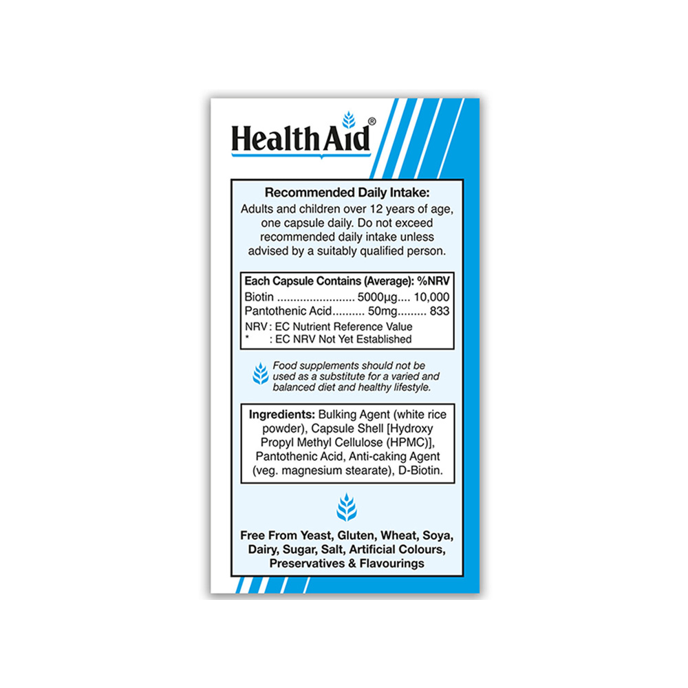 Kapsulat HealthAid Biotin 5000mcg me vitaminë B5 janë pa sheqer dhe kripë të shtuar.