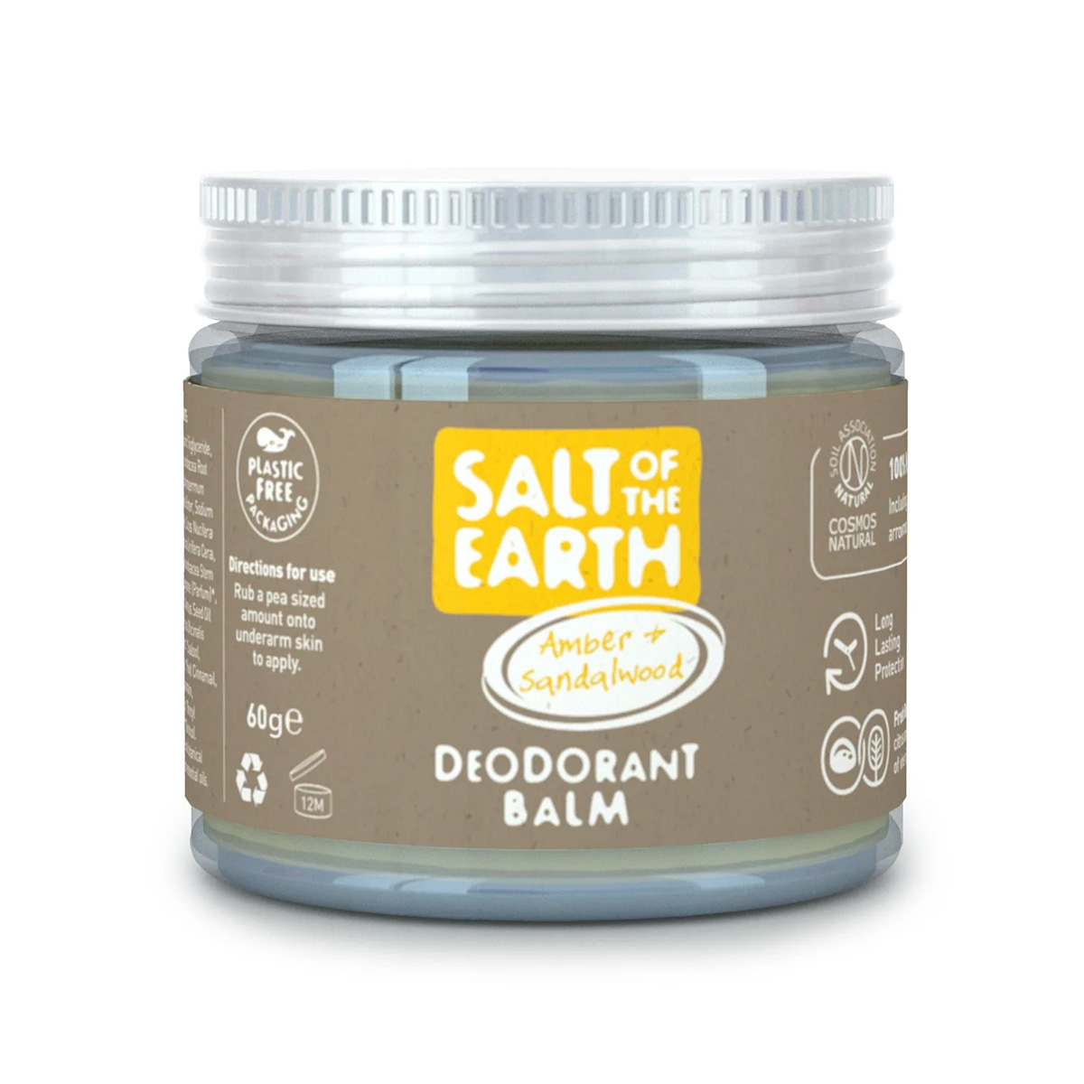 Salt of the Earth Amber & Sandalwood Natural Deodorant Balm ofron mbrojtje afatgjatë dhe efektive kundër erës së trupit. Ky deodorant ne formë balsami është pa plastikë, pa kimikate, me aromë natyrale dhe me ekstrakte botanike, i miratuar nga Shoqëritë vegane dhe vegjetariane.